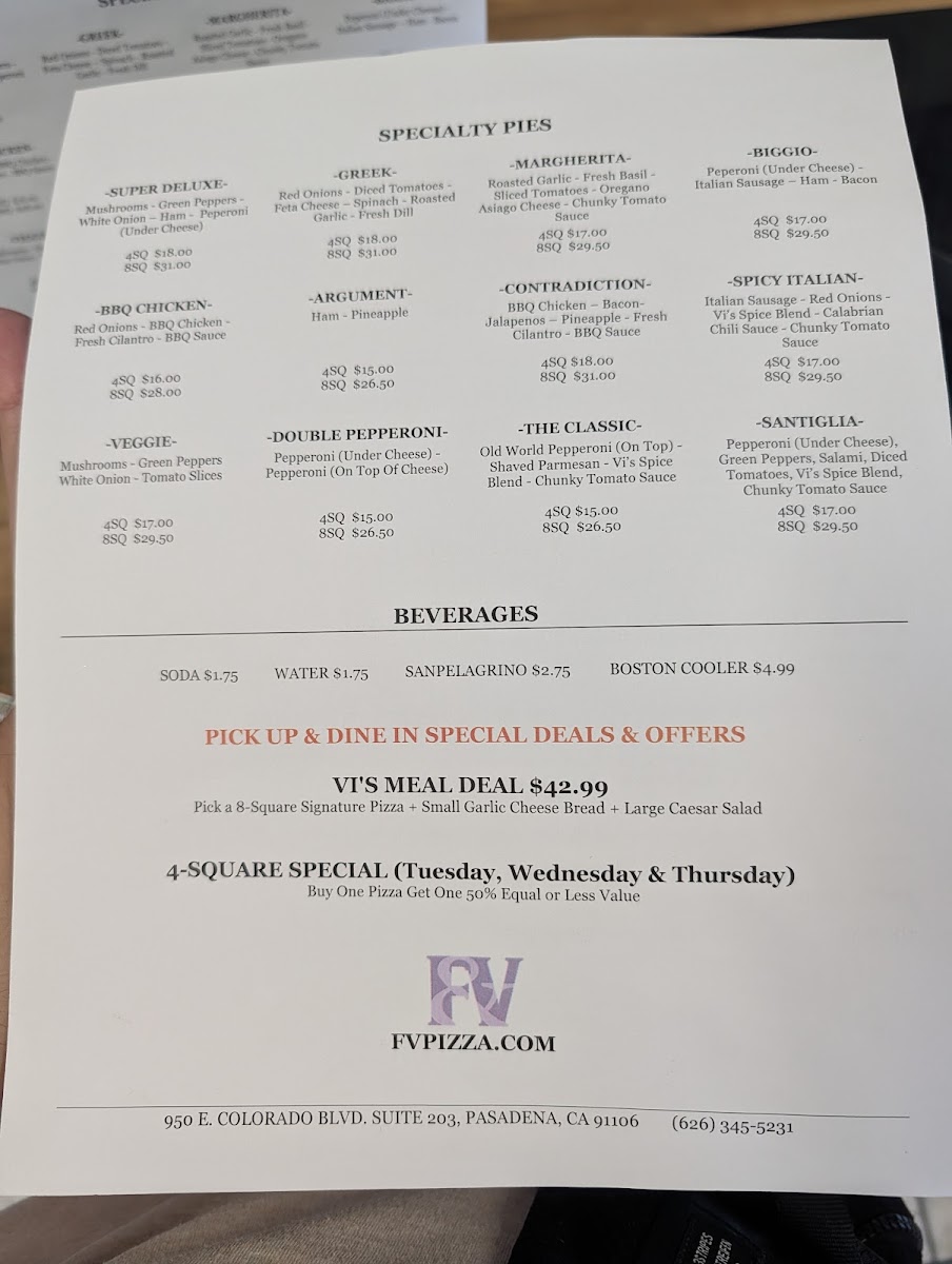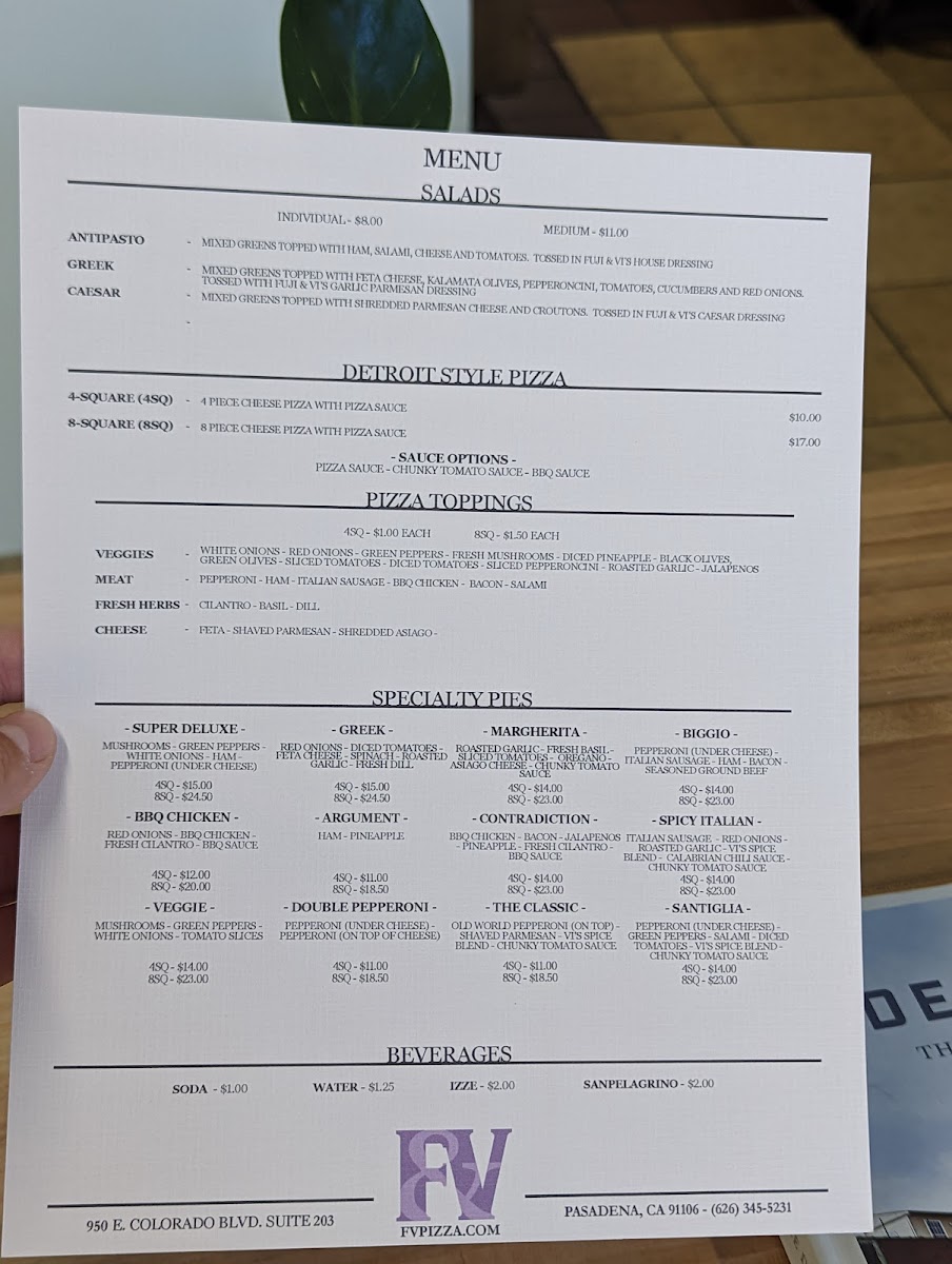 Overall, Fuji & Vi’s Pizza menu offers something for everyone - from savory wings to indulgent Detroit-style pizzas, with sides and salads that complete your meal. With a diverse selection at reasonable prices, it's a perfect spot for a casual dining experience with family and friends.